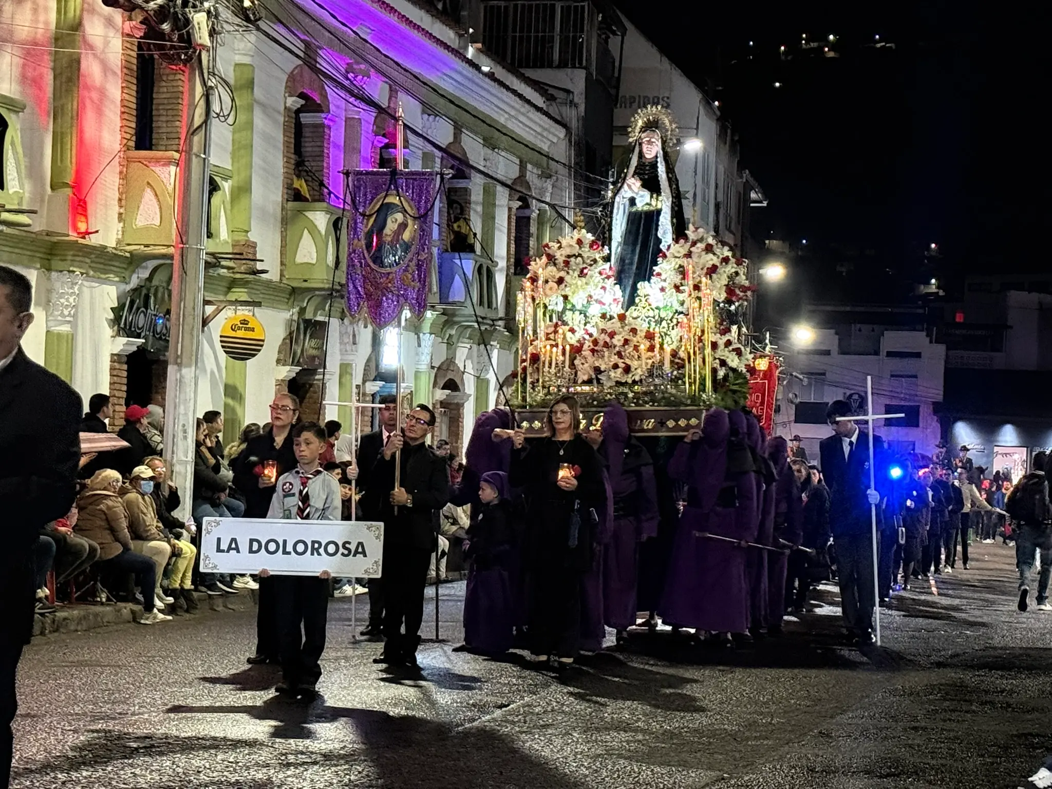 Al caer la noche, las calles se iluminan con velas y faroles. El sonido de la música sacra acompaña el caminar solemne de los participantes mientras las imágenes religiosas —muchas de ellas con décadas de antigüedad— recorren el centro histórico.